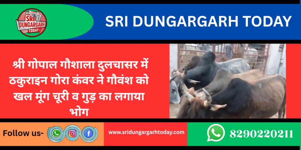 आज श्री गणेश चतुर्थी के पावन अवसर पर ठकुराइन गोरां कंवर धर्मपत्नी ठाकुर मगसिंह पड़िहार निवासी दुलचासर के द्वारा श्री गोपाल गौशाला दुलचासर की समस्त गौ माता एवं गोवंश को बिनोला खल, मुंग चूरी तथा गुड़ का पावन भंडारा कर भोग लगवाया । गौशाला कमेटी ने आप का आभार व्यक्त कर ईश्वर से मंगल करती है कि आप सदैव सुखी स्वस्थ और निरोग रहे। गौशाला सचिव रेवंत सिंह पड़िहार ने बताया कि इस दौरान गांव के रामकिशन ने भी सेवा भाव दिखाते हुए एक कटा ज्वार पक्षियों के लिए समर्पित किया।