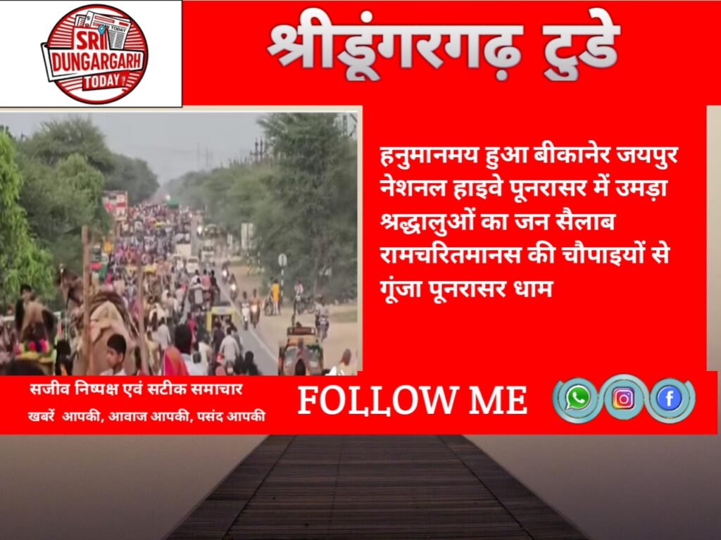 श्री डूंगरगढ़ क्षेत्र का सबसे बड़ा भादवा मेला पूनरासर हनुमान जी महाराज का वार्षिक मेला पूरे परवान पर चल रहा है।बीकानेर जयपुर नेशनल हाइवे पूरा बाबा बजरंगबली के रंग में रंगा हुआ नजर आ रहा है।बीकानेर से 65 किमी दूर पूनरासर धाम तक श्रद्धालुओं का रेला ही रेला नजर आ रहा है।पूनरासर हनुमान जी महाराज के धाम पर देश के कोने कोने से हजारों की तादाद में भक्त पहुंच रहे हैं।हजारों की संख्या में पैदल यात्री संघ पूनरासर धाम के लिए रवाना होकर पहुंच रहे हैं।बाबा के हजारों की संख्या में श्रद्धालुओं ने माथा टेक कर मन्नत मांगी तथा सुख समृद्धि की कामना की । बाला जी महाराज के निज मंदिर ,खेजड़ी धाम पर भक्तों का तांता लगा है।कई दूरी तक बाबा के भक्त कतार में खड़े होकर दर्शन लाभ ले रहे हैं।मंदिर ट्रस्ट द्वारा बाबा के भक्तों घी,शक्कर, आटा निःशुल्क उपलब्ध करवाया जा रहा है।पूनरासर गांव में घरों में भी श्रद्धालु नजर आ रहे हैं।जय सीयाराम धर्मशाला पूरी तरह श्रद्धालुओं से भर गई है।दूरदराज सहित श्री डूंगरगढ़ अंचल से पैदल यात्री संघों का पहुंचना अनवरत जारी है।