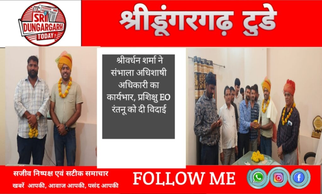 जिला कलेक्टर के आदेशानुसार नगरपालिका श्रीडूंगरगढ़ के रिक्त चल रहे अधिशाषी अधिकारी पद का अतिरिक्त कार्यभार तहसीलदार श्रीवर्धन शर्मा को सौंपा गया है। आदेश की अनुपालना में उन्होंने शुक्रवार को कार्यभार ग्रहण किया। इस अवसर पर नगरपालिका कर्मचारियों ने माला व साफा पहनाकर उनका स्वागत किया।इसी क्रम में प्रशिक्षु अधिशाषी अधिकारी गिरीराज रंतनू की 20 दिवसीय प्रशिक्षण अवधि पूर्ण होने पर पालिका परिसर में विदाई समारोह आयोजित किया गया। समारोह में स्वास्थ्य निरीक्षक हरिश गुर्जर ने माल्यार्पण कर रंतनू का सम्मान किया। कनिष्ठ लेखाकार महेशचंद ज्याणी, जितेंद्र भोजक, सुरजभान प्रजापत, धनराज पांडिया, कुलदीप वाल्मीकि, किशन चांवरिया,जगदीश नाथ सिद्ध सहित नगरपालिका कार्मिक कार्यक्रम में उपस्थित रहे।
