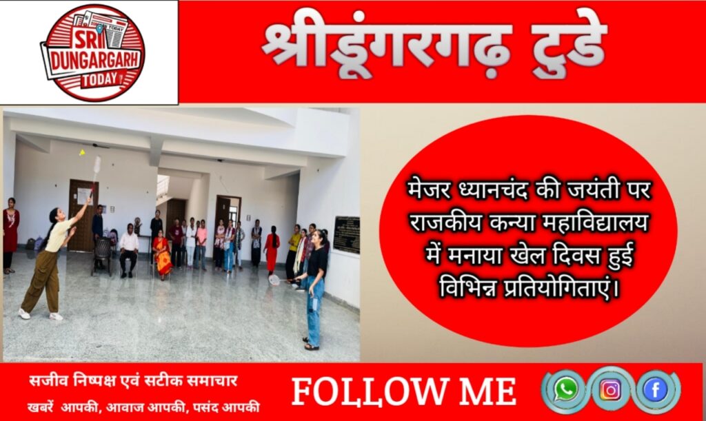 राजकीय सदू देवी पारख कन्या महाविद्यालय श्रीडूंगरगढ़ में राष्ट्रीय खेल दिवस मनाया गया महाविद्यालय के प्रभारी जितेन्द्र सिंह भाटी ने बताया कि हर वर्ष 29 अगस्त को हाकी के जादूगर मेजर ध्यानचंद जी जयंती के उपलक्ष में राष्ट्रीय खेल दिवस मनाया जाता है।यह दिवस भारत की समूद्र खेल परम्पराओं को सम्मान देने तथा छात्राओं एवं नागरिकों में फिटनेस एवं शारीरिक मानसिक स्वास्थ्य बनाए रखने हेतु प्रेरित करने के लिए मनाया जाता है। महाविद्यालय की छात्राओं एवं स्टाफ ने खेल दिवस पर अपने विचार रखे एवं छात्राओं द्वारा खेल एवं व्याम सम्बंधित कार्यक्रमो में भाग लिया। यह कार्यक्रम तीन दिवस तक चलेगा। भारत सरकार के फिट इंडिया मिशन के तहत 29 से 31 अगस्त तक महाविद्यालय में अलग-अलग खेल प्रतियोगिताएँ आयोजित की जाएंगी।