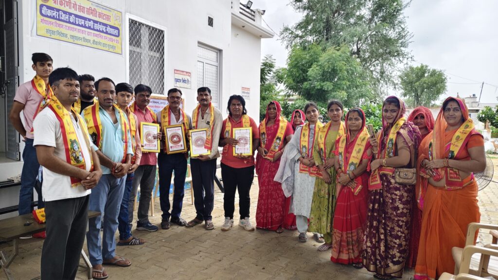 श्री करणी गौशाला कोटासर गौशाला भ्रमण हेतु पधारे कांगला जोशी परिवार भोलासर हाल बीकानेर। गांव भोलासर से स्वर्गीय केसराराम जोशी का पूरा परिवार आज अपने पैतृक गांव कोटासर की श्री करणी गौशाला पधारकर मां करणी के दर्शन किए गौशाला का अवलोकन करते हुए गौ माताओं को गुड़ का पावन भोग लगाया एवं गांव के सभी धार्मिक स्थलों के दर्शन करने हेतु पधारे। गौशाला कमेटी के द्वारा जोशी परिवार को दुपट्टा पहना कर गौशाला स्मृति चिन्ह भेंट करके सम्मान किया गया।