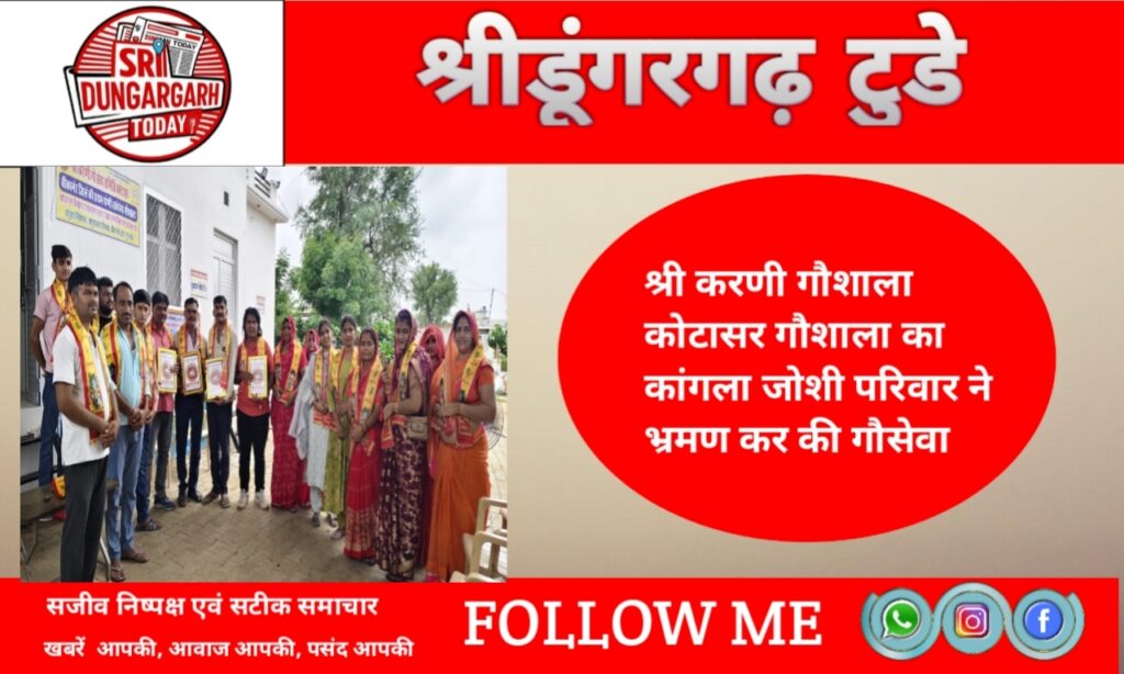 श्री करणी गौशाला कोटासर गौशाला भ्रमण हेतु पधारे कांगला जोशी परिवार भोलासर हाल बीकानेर। गांव भोलासर से स्वर्गीय केसराराम जोशी का पूरा परिवार आज अपने पैतृक गांव कोटासर की श्री करणी गौशाला पधारकर मां करणी के दर्शन किए गौशाला का अवलोकन करते हुए गौ माताओं को गुड़ का पावन भोग लगाया एवं गांव के सभी धार्मिक स्थलों के दर्शन करने हेतु पधारे। गौशाला कमेटी के द्वारा जोशी परिवार को दुपट्टा पहना कर गौशाला स्मृति चिन्ह भेंट करके सम्मान किया गया।