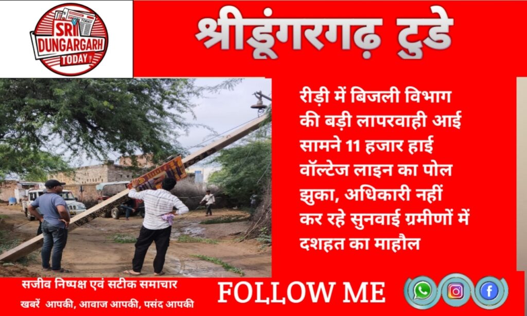 श्रीडूंगरगढ़ उपखंड क्षेत्र के रिड़ी गांव में बिजली विभाग बड़ी लापरवाही सामन आई है। गांव के मुख्य रास्ते पर लगा 11 हजार हाई वोल्टेज लाइन का पोल पिछले 10 दिनों से झुका हुआ है। ग्रमीणों ने बताया कि शुरूआत में पड़ोसियों ने समझ से पोल को सहारा देने के लिए उसे एक घर की दीवार से तारों के सहारे बांध दिया था, लेकिन वह तार टूट गया। उसके बाद से यह पोल लगातार झुका हुआ है और किसी भी समय गिर सकता है। साथ ही इसमें करंट का खतरा भी बना हुआ है। जिससे आएस-पास के घरों के लोगो मे डर का माहौल बना हुआ है। ग्रमीणों ने बताया कि बिजली विभाग के अधिकारियों को शिकायत कर स्थिति से अवगत करवाया, लेकिन अब तक कोई कार्यवाही नही हुई। ग्रमीणों का कहना है कि विभाग आखिर किसी बड़ी अनहोनी का इंतजार क्यों कर रहा है? यह पोल गांव से ऊपनी के रास्ते केऊ की ओर जाता है और यहां से बड़े वाहन व ग्रामीणों की आवाजाही लगातार होती रहती है। ऐसे में यदि यह पोल गिर गया तो 11 हजार हाई वॉल्टेज लाइन से बड़ा हादसा और जनहानि होना तय है। ऐसे में ग्रमीणों का कहना है कि प्रशासन जल्द से जल्द इस समस्या का समाधान करवाए।