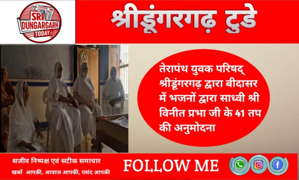तेरापंथ युवक परिषद्, श्रीडूंगरगढ़ की सुप्रसिद्ध भक्ति संगीत मंडली “श्रीडूंगरगढ़ स्वर लहरी” टीम ने बीदासर में साध्वी श्री विनीत प्रभा जी के 41 दिवसीय कठिन तप की अनुमोदना भजनों के माध्यम से की।