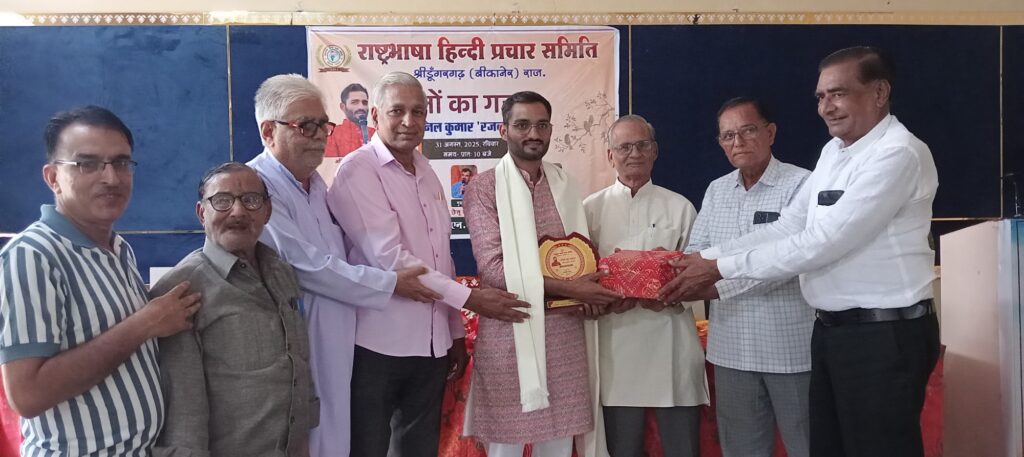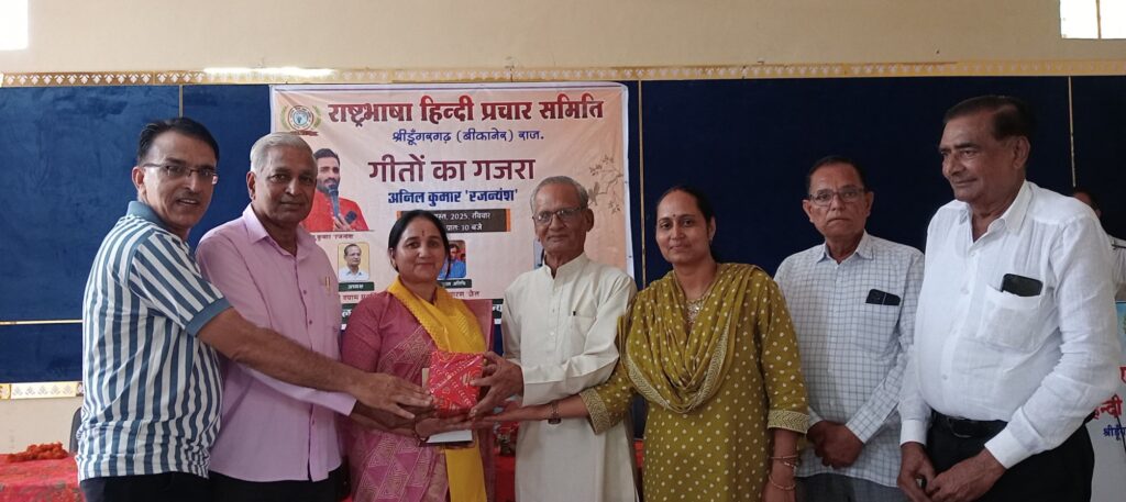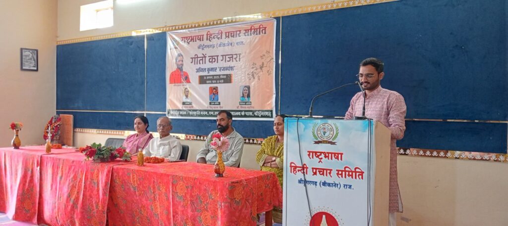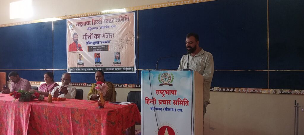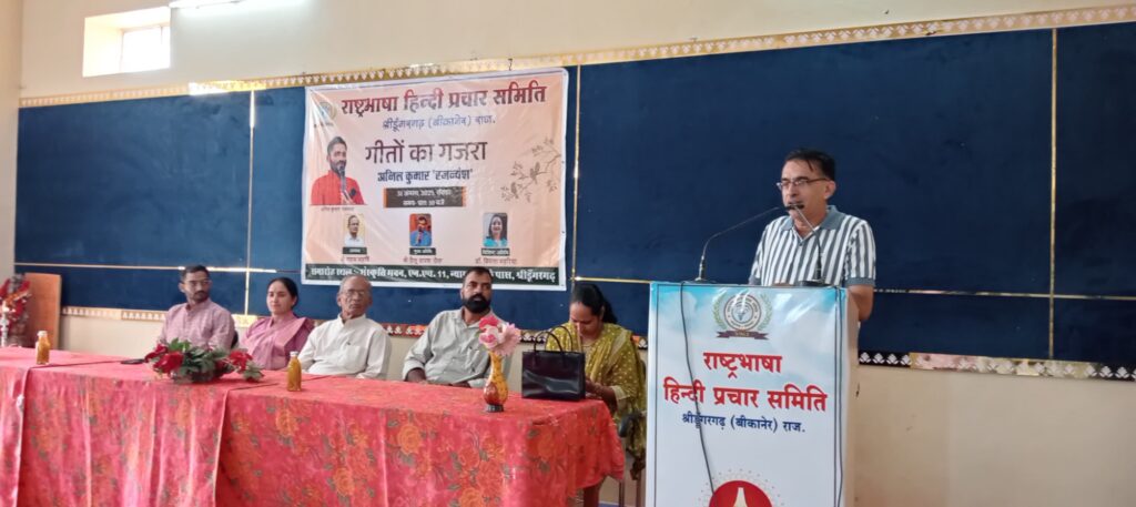 राष्ट्रभाषा हिंदी प्रचार समिति द्वारा संस्कृति भवन में रविवार को ‘गीतों का गजरा’ सजाया गया। कवि अनिल कुमार ‘रजन्यंश’ ने “मन के मन के टूटे सब तार मन के, ठन के ठन के छूटे सब यार ठन के..“ सुनाकर खूब दाद बटोरी तो श्रृंगार रस का स्वरचित प्रतिनिधि गीत सुनाकर श्रोताओं को भाव विभोर किया। अनिल ने इंस्टाग्राम पर तंज कसते हुए जीवन में बढ़ते तकनीकी दखल पर चिंता भी जताई। कार्यक्रम में विशिष्ट अतिथि डॉ विमला महरिया ने मधूर स्वर में लोकगीत बावनिया सुनाकर हंसाया व लोकसंस्कृति की झलक सजाई। विमला ने होली के रंग पर व्यंग्य सुनाया जिसमें बढ़ती तकनीक के कारण होली का रंग फीका पड़ जाने को केंद्रित किया। कवि प्रदीप महरिया ने भी आज की राजनीति पर कटाक्ष करते हुए नेता और भ्रष्टाचारी को राजस्थानी गीत में अच्छा लपेटा। वहीं कार्यक्रम में मुख्य अतिथि छैलू चारण ‘छैल’ ने करणी अराधना से काव्यपाठ प्रारंभ किया और वात्सल्य रस पर भावभरा छंद सुनाया। छैल ने राजस्थानी भाषा को मान्यता नहीं मिलने का दोष राजनीति को देते हुए ‘नेतावां को करें गणुगान निज मान भूल गया..’ का ओलमा भी लिखने वालों को दिया। छैल ने श्रृंगार रस में भी सुनाया। संस्था द्वारा सभी कवियों का सम्मान किया गया। कार्यक्रम अध्यक्ष श्याम महर्षि ने युवाओं को जिम्मेदारी पूर्ण कार्य करने की प्रेरणा देते हुए, साहित्य की काव्य विधा को संवर्द्धित करने में योगदान देने की बात कही। सत्यदीप भोजक ने सभी का आभार व्यक्त किया। कवियत्री भगवती पारीक ‘मनु’ ने मंच संचालन किया।