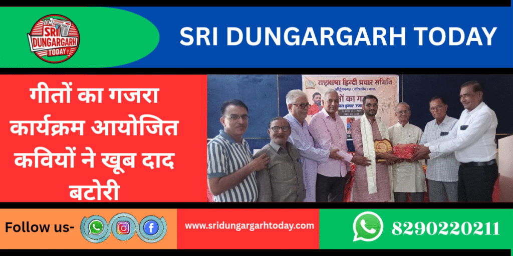 गीतों का गजरा कार्यक्रम में काव्य प्रेमी लोगों ने भाग लिया व काव्य रस का आनंद लिया। संस्था मंत्री रवि पुरोहित, डॉ मदन सैनी, सत्यनारायण योगी, रामचन्द्र राठी, नारायण सारस्वत, महेश जोशी, महावीर सारस्वत, तुलसीराम चोरड़िया, विजय महर्षि, सरोज शर्मा, मनसा सोनी, पवन सारस्वत, विश्वनाथ तंवर, अब्दुल शकूर सिसोदिया, पूनमचंद गोदारा, प्रदीप कुमार दीप, बुधमल सैनी, संजय पारीक, शुभकरण पारीक, मुकेश कुमार, राज सर, अमित सहित अन्य लोग उपस्थित रहें।