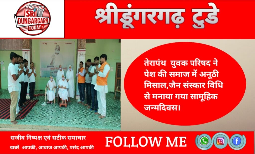 रविवार को मालू भवन में तेयुप श्रीडूंगरगढ़ द्वारा त्रिआयामी उपक्रम सेवा, संस्कार, संगठन के अंतर्गत जैन संस्कार विधि से सामूहिक जन्म दिवस का आयोजन किया गया। जिसमें प्रमोद बोथरा,मनीष नौलखा,दीपक छाजेड़ सुमित बरडिया,अजय बोथरा व दीपांशु तातेड़ (6 सदस्यों) का जन्मदिवस जैन संस्कार विधि से  मनाया गया।
