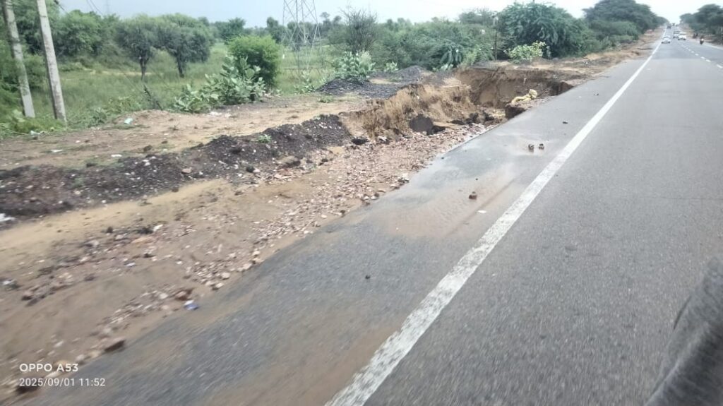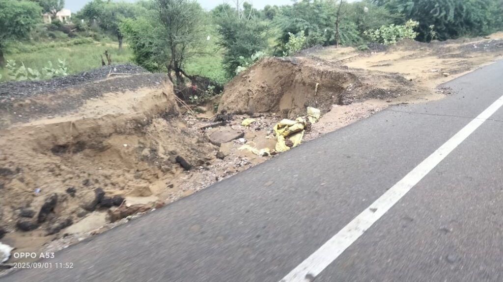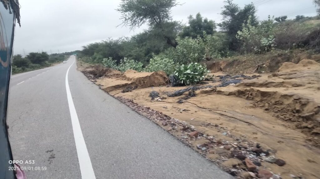 श्री डूंगरगढ़ अंचल में रविवार को हुई भारी बरसात से हालात विकट हो गए हैं।कई मकान धराशाई हो गए हैं तो कई घरों में पानी भरने से मकानों के गिरने का खतरा बढ़ गया है।रविवार को हुई झमाझम बरसात के कारण बीकानेर जयपुर राष्ट्रीय राजमार्ग संख्या 11 के किनारों पर जानलेवा कटाव बन गए हैं जो किसी बड़ी दुर्घटना का कारण बन सकते है।श्री डूंगरगढ़ से रतनगढ़ रोड़ पर कई जगह नेशनल हाइवे के किनारों पर कई फिट लम्बे चौड़े कटाव हर समय मौत को खुली दावत दे रहे हाइवे अथॉरिटी कंपनी की गंभीर लापरवाही को उजागर कर रहे हैं।वाहन चालक महावीर प्रसाद,धनराज,महादेव सहित वाहन चालकों ने बताया कि श्री डूंगरगढ़ से रतनगढ़ रोड़ पर सिखवाल उपवन,सीमेंट फैक्ट्री के पास हाइवे के किनारों पर बड़े बड़े कटाव सुरसा की तरह मुंह बायें खुलेआम मौत को बुलावा दे रहे हैं।वाहन चालकों ने कहा कि हाइवे निर्माण कंपनी टोल वसूलने में मशगूल है।हाइवे निर्माण कंपनी को मुसाफिरों की सुरक्षा से कोई सरोकार नजर नहीं आ रहा है।रात के समय अगर भूल कर भी वाहन चालक साइड दबा दे तो दुर्घटना से बच पाना मुश्किल नजर आता है।वाहन चालकों का कहना है कि हर बार बरसात में हाइवे किनारों पर बड़े बड़े कटाव बन जाते हैं हाइवे निर्माण कंपनी द्वारा मिट्टी डालकर भर तो दिया जाता है लेकिन स्थाई रूप से कोई समाधान नहीं होने के कारण बरसात के पानी से फिर कटाव आ जाते है।हाइवे के किनारों पर बनी पानी निकासी की नाली से पानी की निकासी नहीं होने के कारण रविवार को हुई भारी बरसात से नेशनल हाइवे पर हनुमान धोरा,राजकीय सदु देवी पारख कन्या महाविद्यालय के सामने हाइवे पर पानी भरने से एक बार तो जाम के हालात बन गए।हालांकि सोमवार को हाइवे पेट्रोलिंग टीम द्वारा टैंकरों से पानी निकाल दिया गया।वाहन चालकों ने हाइवे निर्माण कंपनी से नेशनल हाइवे के किनारों पर बने जानलेवा खड्डों को अति शीघ्र भरने की मांग की है ताकि समय रहते किसी बड़े हादसे को टाला जा सके।