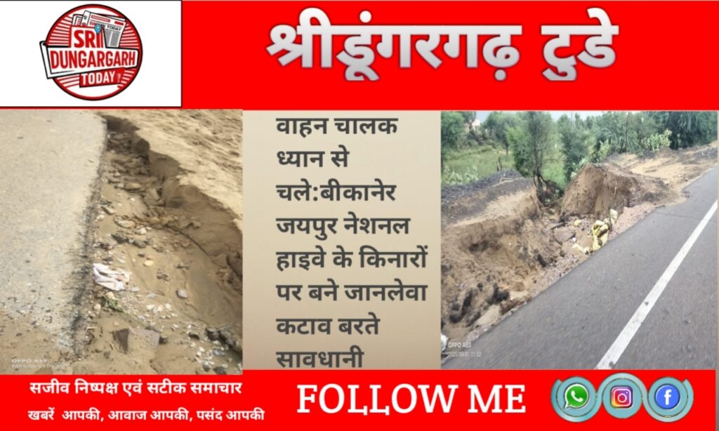 श्री डूंगरगढ़ अंचल में रविवार को हुई भारी बरसात से हालात विकट हो गए हैं।कई मकान धराशाई हो गए हैं तो कई घरों में पानी भरने से मकानों के गिरने का खतरा बढ़ गया है।रविवार को हुई झमाझम बरसात के कारण बीकानेर जयपुर राष्ट्रीय राजमार्ग संख्या 11 के किनारों पर जानलेवा कटाव बन गए हैं जो किसी बड़ी दुर्घटना का कारण बन सकते है।श्री डूंगरगढ़ से रतनगढ़ रोड़ पर कई जगह नेशनल हाइवे के किनारों पर कई फिट लम्बे चौड़े कटाव हर समय मौत को खुली दावत दे रहे हाइवे अथॉरिटी कंपनी की गंभीर लापरवाही को उजागर कर रहे हैं।वाहन चालक महावीर प्रसाद,धनराज,महादेव सहित वाहन चालकों ने बताया कि श्री डूंगरगढ़ से रतनगढ़ रोड़ पर सिखवाल उपवन,सीमेंट फैक्ट्री के पास हाइवे के किनारों पर बड़े बड़े कटाव सुरसा की तरह मुंह बायें खुलेआम मौत को बुलावा दे रहे हैं।वाहन चालकों ने कहा कि हाइवे निर्माण कंपनी टोल वसूलने में मशगूल है।हाइवे निर्माण कंपनी को मुसाफिरों की सुरक्षा से कोई सरोकार नजर नहीं आ रहा है।रात के समय अगर भूल कर भी वाहन चालक साइड दबा दे तो दुर्घटना से बच पाना मुश्किल नजर आता है।वाहन चालकों का कहना है कि हर बार बरसात में हाइवे किनारों पर बड़े बड़े कटाव बन जाते हैं हाइवे निर्माण कंपनी द्वारा मिट्टी डालकर भर तो दिया जाता है लेकिन स्थाई रूप से कोई समाधान नहीं होने के कारण बरसात के पानी से फिर कटाव आ जाते है।हाइवे के किनारों पर बनी पानी निकासी की नाली से पानी की निकासी नहीं होने के कारण रविवार को हुई भारी बरसात से नेशनल हाइवे पर हनुमान धोरा,राजकीय सदु देवी पारख कन्या महाविद्यालय के सामने हाइवे पर पानी भरने से एक बार तो जाम के हालात बन गए।हालांकि सोमवार को हाइवे पेट्रोलिंग टीम द्वारा टैंकरों से पानी निकाल दिया गया।वाहन चालकों ने हाइवे निर्माण कंपनी से नेशनल हाइवे के किनारों पर बने जानलेवा खड्डों को अति शीघ्र भरने की मांग की है ताकि समय रहते किसी बड़े हादसे को टाला जा सके।