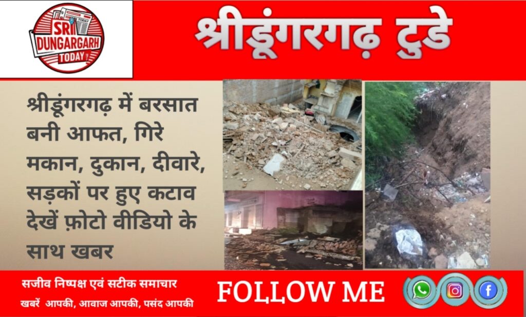 रविवार को कस्बे में रिकॉर्ड तोड़ बरसात हुई है। शाम 5 बजे के बाद 122 एमएम बरसात हुई। बूंदाबांदी का दौर देर रात तक जारी रहा। श्रीडूंगरगढ में निचले इलाके जलमग्न है। लोग राहत का इंतजार कर रहें है। दुकान, मकान, कई दीवारें ढह गई वहीं सड़कें व रास्तों में भारी कटाव आ गया है। अमीर पट्टी बाजार में एक मकान में दुकान देर रात भर्राभरा कर गिर गई। यहां गजानंद सोनी की हवेली का एक हिस्सा भी गिर गया। परिवार यहां मलबे के नीचे 20 संदूकें, 2 अलमारी दब गई है। वहीं राशन पानी का सामान, कपड़े सहित घर का सारा सामान पानी में भिग गया है। नुकसान का आंकलन अभी नहीं हो पाया है। इसी के लगते हुए अमीर पट्टी में एक दुकान व एक हॉल की दीवार भी गिर गई। जिसमें राशन का सामान नीचे दब गया है व नुकसान का आंकलन मलबा हटने के बाद ही किया जा सकेगा। गौरव पथ रोड़ पर पुराना मकान भी गिर गया है। वही बिग्गा बास पानी के तेज बहाव में गणेश मंदिर की दीवार ढह गई व पानी मंदिर तक चला गया। वार्ड 33 में कटाव होने से सड़क ही बह गई और गहरा गड्ढा हो गया। वहीं कोर्ट के पीछे स्थित योग मैदान की दीवार जो कुछ दिन पहले ही पालिका ने बनाई थी गिर गई। यहां मिट्टी ढह गई और खाई सी बन गई। बिग्गा बास डागा के घर में पानी में पानी भर गया। वही स्टेशन रोड़ पर पुराना बिजली घर भरभरा कर गिर गया लोगों को प्रशासन से राहत व मदद दिए जाने की उम्मीद है।