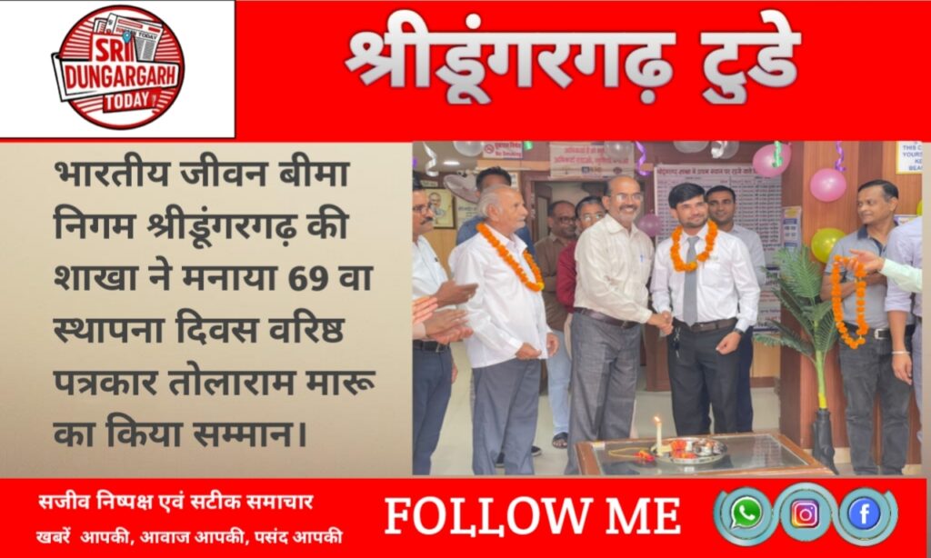 भारतीय जीवन बीमा निगम श्रीडूंगरगढ़ की शाखा ने मनाया 69 वा स्थापना दिवस वरिष्ठ पत्रकार तोलाराम मारू का किया सम्मान।