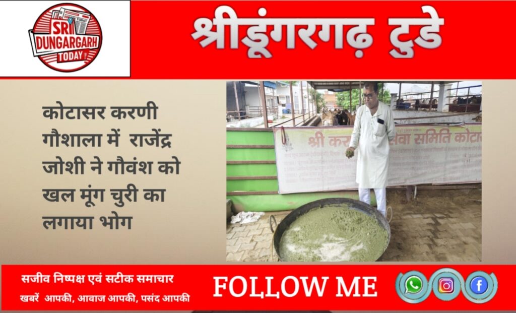 श्री करणी गो सेवा समिति गौशाला कोटासर गौशाला के भामाशाह परम गौ भक्त राजेंद्र कुमार जोशी गंगाशहर हाल बॉम्बे मंगलवार को भोमिया जी दादोसा महाराज के मेला के पावन अवसर पर गौशाला पधारकर गौ माताओं को मुंग चूरी का अति पावन भंडारा समर्पित कर गौ सेवा का सौभाग्य प्राप्त किया गौशाला कमेटी ने पूरे परिवार के लिए सुख समृद्धि की कामना करते हुए आभार व्यक्त किया।