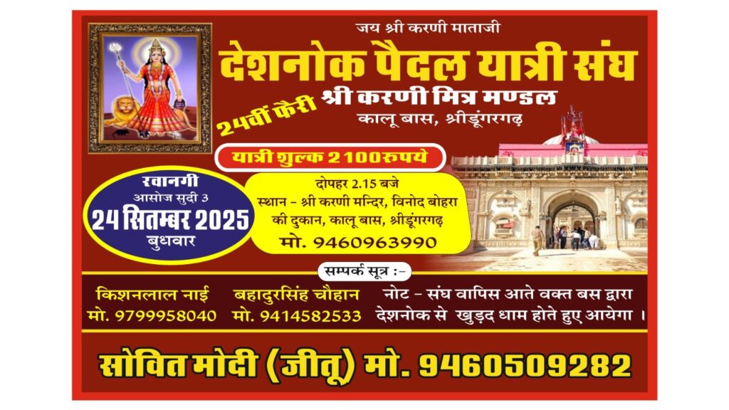 श्रीडूंगरगढ़ आगामी 24 सितंबर 2025 को कालू बास से श्रीकरणी मित्र मंडल के बैनर तले देशनोक पैदल यात्री संघ रवाना होगा। संघ की ये 24 वीं फैरी होगी संघ के किशनलाल नाई ने बताया कि संघ कालू बास के श्रीकरणी मंदिर से दोपहर सवा दौ बजे धूमधाम से रवाना होगा संघ में शामिल होने के लिए आप अग्रिम पंजीयन करवा सकते है। संघ के बहादूरसिंह चौहान ने बताया कि संघ पैदल देशनोक पहुंचकर माँ करणी के दरबार में धोक लगाने के बाद लौटने के दौरान बस द्वारा खुड़द धाम में इंद्र बाईसा के दर्शन करते हुए श्रीडूंगरगढ़ पहुंचेगा। इस संघ में शामिल होने के लिए 9799958040 व 9414582533 तथा 9460509282पर अपना पंजीयन करवा सकते है।