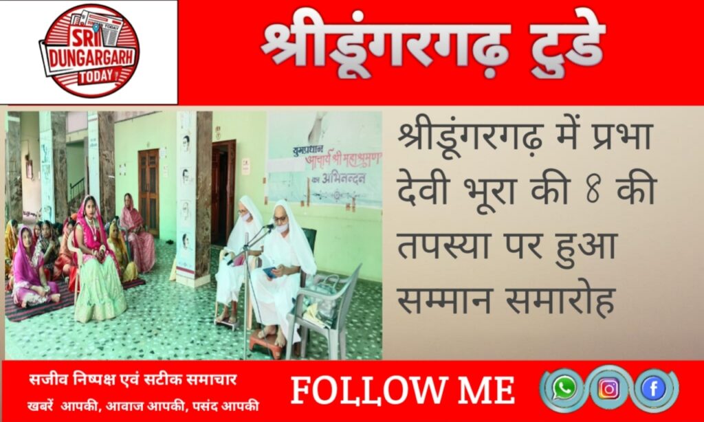 श्रीडूंगरगढ़ सेवाकेंद्र मालू भवन में बुधवार को साध्वी संगीतश्री एवं डॉ. परमप्रभा के सान्निध्य में प्रभा देवी भूरा की 8 की तपस्या पर विशेष कार्यक्रम आयोजित हुआ।
