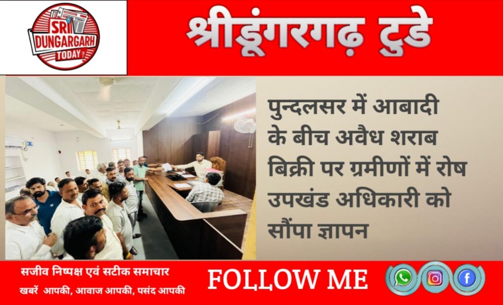 गांव पुन्दलसर में आबादी क्षेत्र के बीचों बीच अवैध शराब की बिक्री से ग्रामीणों में आक्रोश फैल गया है। गुरुवार को गांववासियों ने सामूहिक रूप से उपखंड अधिकारी को ज्ञापन सौंपकर ठेका तुरंत बंद करवाने की मांग की। ग्रामीणों का कहना है कि सामुदायिक भवन के पास सार्वजनिक चौपाल के पास अवैध शराब के ठेके का संचालन किया जा रहा है। यह ठेका महज 50-60 मीटर की दूरी पर स्थित राजकीय उच्च माध्यमिक विद्यालय और आंगनबाड़ी केंद्र के नजदीक है। वहीं 30 मीटर दूर जमवाय माता मंदिर और ठाकुरजी का मंदिर भी स्थित हैं। पास ही गांव का मुख्य कुआं और सनातन संस्कृति का प्रतीक पीपल वृक्ष है। श्मशान भूमि और गौशाला भी इसी क्षेत्र में हैं। यह रास्ता पंचायत भवन, टैक्सी स्टैंड और श्रीडूंगरगढ़ जाने के लिए मुख्य मार्ग है। ग्रामवासियों ने बताया कि इस ठेके के कारण चौपाल और आसपास के इलाके में दिन रात असामाजिक तत्वों का जमावड़ा रहता है। महिलाएं, छात्र छात्राएं, गौसेवक और श्रद्धालु असहज माहौल में परेशान हो रहे हैं। वहीं, किसी भी अप्रिय घटना की आशंका बनी हुई है। गौरतलब है कि वर्ष 2019 में ग्राम सभा की सर्वसम्मति से प्रस्ताव पारित कर गांव की आबादी से दूर शराब बिक्री पर प्रतिबंध लगाया गया था। उस समय भी ज्ञापन पुलिस थानाधिकारी, उपखंड अधिकारी और जिला कलक्टर को दिया गया था, लेकिन अब एक बार फिर उसी नियम की धज्जियां उड़ाते हुए ठेके का संचालन हो रहा है।इसके साथ ही ग्रामीणों ने सीबीईओ को भी ज्ञापन सौंपा है और शराब ठेके को हटवाने की बात कही है।ग्रामीणों ने चेतावनी दी है कि यदि शीघ्र कार्रवाई नहीं की गई तो मजबूरन धरना-प्रदर्शन करना पड़ेगा और आंदोलन के दौरान किसी भी प्रकार की जनहानि या उपद्रव की स्थिति बनी तो इसकी पूरी जिम्मेदारी प्रशासन की होगी।