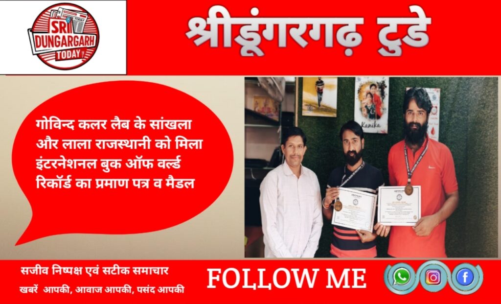 गोविन्द कलर लैब के सांखला और लाला राजस्थानी को मिला इंटरनेशनल बुक ऑफ वर्ल्ड रिकॉर्ड का प्रमाण पत्र व मैडल