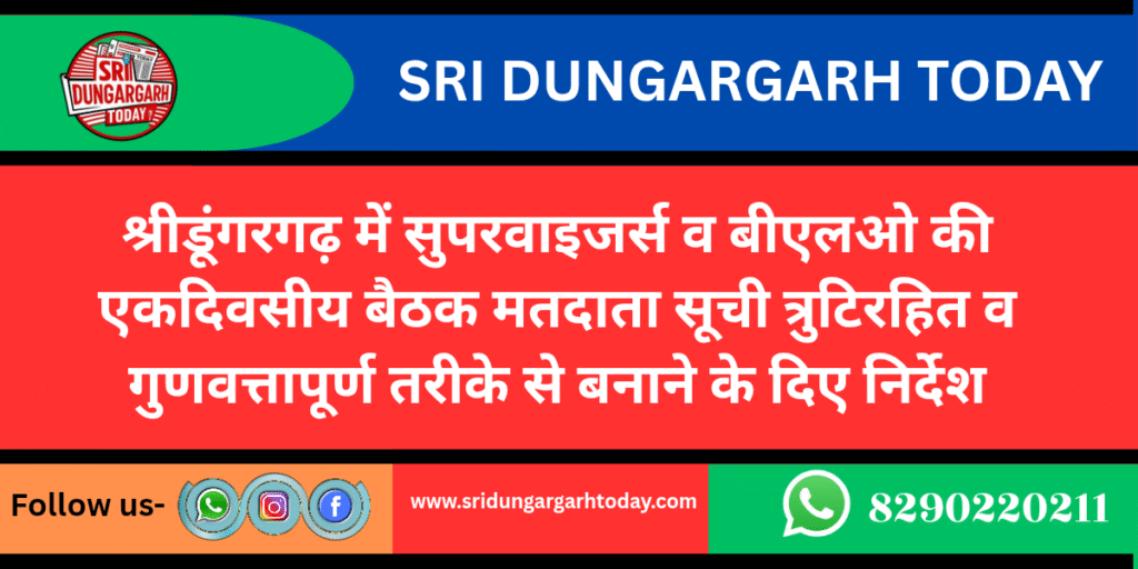 पंचायत समिति सभागार में शुक्रवार को विधानसभा क्षेत्र के 21 सुपरवाइजर्स एवं 200 बूथ लेवल अधिकारियों की एक दिवसीय बैठक का आयोजन हुआ बैठक की अध्यक्षता रजिस्ट्रीकरण पदाधिकारी एवं उपखंड अधिकारी शुभम शर्मा ने की एंव नायब तहसीलदार रमेश सिंह चौहान ने पर्यवेक्षण में किया बैठक में ग्राम पंचायत की वार्ड वार सूचियां त्रुटिरहित एवं गुणवत्तापूर्ण तरीके से तैयार कर अपने कार्य को निष्पक्षता एवं पारदर्शिता पूर्वक करने पर जोर देते हुए अर्हता दिनांक 1 जनवरी 2025 के अनुसार कोई भी मतदाता वंचित न रहे इसका प्रयास किये जाने हेतु निर्देशित किया गया। जिला स्तरीय मास्टर ट्रेनर पवन कुमार और विधानसभा ट्रेनर नौरतमल, सहीराम, मनीष कुमार, श्रवण कुमार ने सुपरवाइजर और बीएलओ को प्रशिक्षण दिया। वहीं निर्वाचन शाखा के मुकेश कुमार लीलाराम भव्य कटारिया पूरबचंद, मांगीलाल ने फॉर्मेट ए तथा ए 1 तैयार करने में संबंधित बूथ लेवल अधिकारी की सहायता की। सभी अधिकारियों को निर्वाचन विभाग के तय कार्यक्रम के अनुसार कार्य समय पर और पारदर्शिता के साथ करने निर्देश दिए गए।