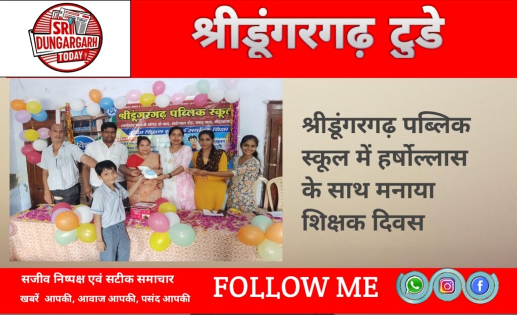 श्रीडूंगरगढ़ पब्लिक स्कूल में आज शिक्षक दिवस हर्षोल्लास के साथ मनाया गया इस अवसर पर विद्यालय को रंग-बिरंगी ग़ुब्बारों व फूलों से सजाया गया। विद्यार्थियों ने शिक्षकों को प्रतीक चिन्ह भेंट कर सम्मानित किया विद्यालय के संचालक कान्ति प्रकाश दर्जी ने डॉ राधाकृष्णन के जीवन के महत्व को समझाते हुए विद्यार्थियों का मार्गदर्शन किया। विद्यालय के वरिष्ठ शिक्षक रणजीत नाई ने जीवन में शिक्षक की उपयोगिता के बारे में बताया।