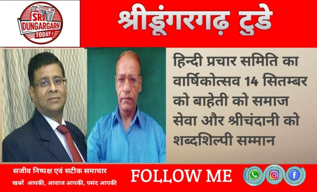 राष्ट्रभाषा हिन्दी प्रचार समिति, श्रीडूंगरगढ का वार्षिकोत्सव 14 सितम्बर को प्रातः 10.15 बजे संस्कृति सभागार में आयोजित किया जाएगा। यह जानकारी देते हुए संस्थाध्यक्ष श्याम महर्षि ने बताया कि इस अवसर पर दिल्ली प्रवासी प्रख्यात समाजसेवी और उद्योगपति हरीशंकर बाहेती को सामाजिक सरोकारों के प्रति उनके योगदान के लिए रामकिशन उपाध्याय स्मृति समाज सेवा सम्मान और अजमेर के लब्ध प्रतिष्ठ साहित्यकार सुरेश श्रीचंदानी को उनके साहित्यिक अवदान के लिए संस्था के प्रतिष्ठित शब्दशिल्पी सम्मान से समादृत किया जायेगा। रामकिशन उपाध्याय स्मृति समाज सेवा सम्मान के तहत ग्यारह हजार रूपये नगद और शब्दशिल्पी सम्मान के तहत सम्मान-पत्र, स्मृति-चिह्न, शॉल आदि यथा संस्था निर्णय अर्पित किए जायेंगे । संस्था के मंत्री रवि पुरोहित ने बताया कि महाराजा गंगासिंह विश्वविद्यालय के कुलगुरु आचार्य मनोज दीक्षित की अध्यक्षता और स्थानीय विधायक श्री ताराचंद सारस्वत के मुख्य आतिथ्य में आयोज्य संस्था के वार्षिकोत्सव में हिन्दी और कृत्रिम बुद्धिमता: सम्भावनाएं और चुनौतियां विषय पर परिसंवाद होगा। उपखण्ड अधिकारी शुभम शर्मा और साहित्यकार-समालोचक डॉ. गजादान चारण, डीडवाना विशिष्ट अतिथि के रूप में सहभागिता निभायेंगेे। विषय प्रवर्तन शिक्षाविद् समालोचक डॉ. उमाकांत गुप्त, बीकानेर करेंगे। संस्था के उपाध्यक्ष डॉ. मदन सैनी ने बताया कि समारोह में डॉ. पद्मजा शर्मा, जोधपुर को मलाराम माली स्मृति साहित्यश्री सम्मान, श्री देवेन्द्र कुमार मिश्रा, जबलपुर को डॉ. नंदलाल महर्षि स्मृति हिन्दी सृजन पुरस्कार, संगीता सेठी, बीकानेर को श्री शिवप्रसाद सिखवाल स्मृति महिला लेखन पुरस्कार, कुमार सुरेश, भोपाल को सुरेश कंचन ओझा इतर साहित्यिक लेखन पुरस्कार, विश्वनाथ तंवर, सरदारशहर को श्री चन्द्रमोहन हाड़ा हिमकर स्मृति उपन्यास लेखन पुरस्कार, डॉ. नागेश पाण्डेय,शाहजहांपुर को श्री श्याम सुन्दर नागला स्मृति बाल साहित्य पुरस्कार भी समारोह में प्रदान किये जायेंगे। प्रचार मंत्री महावीर सारस्वत ने बताया कि एक दिवसीय राष्ट्रीय समारोह में देश-भर से सौ से अधिक साहित्यकार, विचारक, चिंतक और शिक्षाविद् भाग लेंगे।
