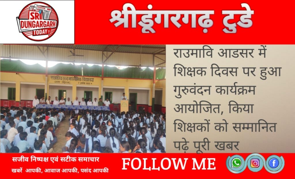राउमावि आडसर में शिक्षक दिवस के उपलक्ष्य पर गुरूवंदन कार्यक्रम का आयोजन हुआ कार्यक्रम में विद्यालय में सत्र 1995 से 1997 तक अध्यापन करवाने वाले चार वरिष्ठ शिक्षकों का सम्मान किया गया। जिसमें राजीव श्रीवास्तव, विष्णु जाडीवाल, मोहन शर्मा तथा तोलाराम तिवाड़ी को फूलमाला व साफ़ा पहनाकर व प्रतीक चिन्ह भेंट कर सम्मानित किया गया। कार्यक्रम की शुरुआत माँ सरस्वती पूजन से हुई बता देवें की उक्त दो सत्रों में विद्यालय के प्राचार्य पवन शर्मा ने इन्ही गुरुजनो से पढ़कर तत्समय बोर्ड परीक्षा में शाला टॉप किया था। इस दौरान गांव से बड़ी संख्या में पूर्व छात्रों ने विद्यालय पहुंचकर शिक्षकों का सम्मान किया। जिसमें भगवती प्रसाद जोशी नरेंद्र आरी, पूर्व सरपंच भरत नाई,शिव स्वामी किशन नाई सुरेश सिंह, अर्जुन सिंह, गंगाधर, रामनिवास, मनोज लखारा शामिल रहे। इस दौरान विद्यालय के समस्त स्टाफ सहित विद्यार्थी उपस्थित रहे। कार्यक्रम का सफल संयोजन गोवर्धन डूडी ने किया।