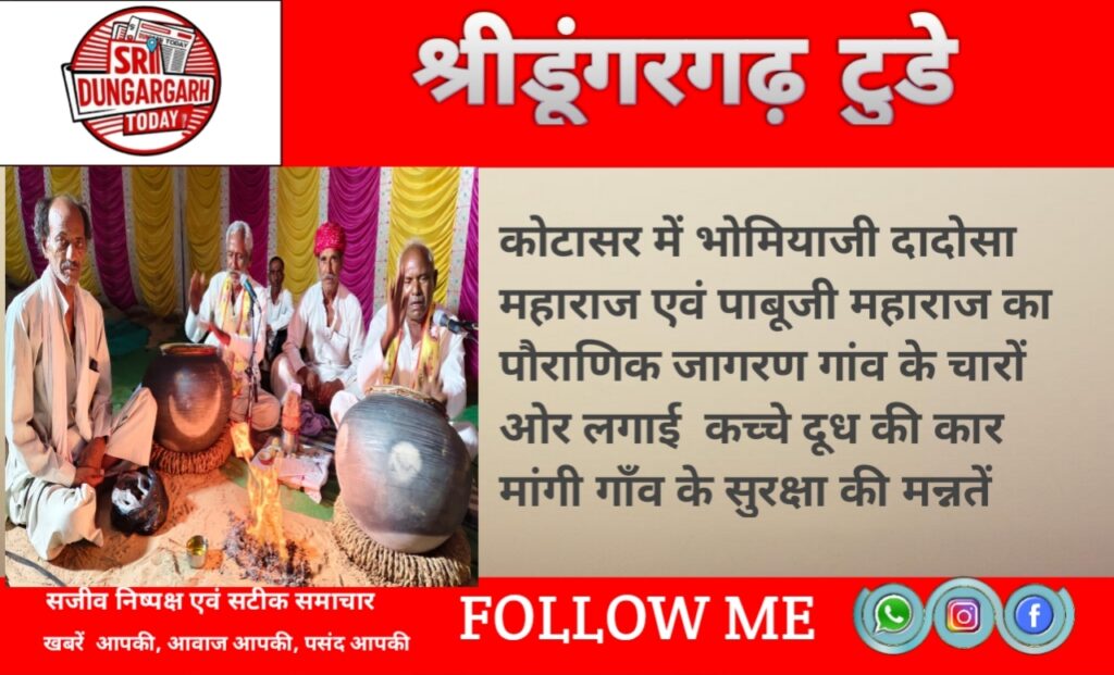 क्षेत्र के गांव कोटासर में भोमिया जी महाराज के मंदिर पर भादवा सुदी तेरस को भव्य विशाल कि जागरण का आयोजन हुआ जागरण में सुप्रसिद्ध कलाकार हरी राणा गुड़ा निवासी एवं मांगीलाल जाखासर ने भजनो की प्रस्तुतियां दी। इस दौरान श्रद्धालु बाबा के भजनों पर खूब झूमे देर रात तक जयकारें गूंजते रहे। कोटासर सहित गांव दुलचासर, सूडसर, सांवतसर से भी बड़ी सँख्या में श्रद्धालु पहुंचे। मध्य रात्रि गांव के चारों तरफ गाय कच्चे दूध की कार लगाकर गांव के रक्षा की मन्नतें मांगी सामूहिक रूप से ग्राम वासियों ने जागरण में बढ़ चढ़कर सहयोग किया युवाओं ने जागरण की सम्पूर्ण व्यवस्था संभाली ।