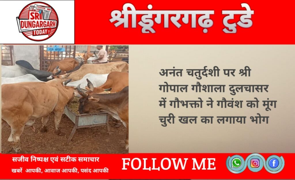 आज अनंत चतुर्दशी के पावन शुभ अवसर पर देवेन्द्र सिंह राठौड़ निवासी हंसासर ने श्री गोपाल गौशाला दुलचासर की गौमाताओं को विनौला खल, मुंग चूरी का पावन भंडारा कर भोग लगाया । सचिव रेवन्त सिंह पड़िहार ने बताया कि वहीं चुन्नीलाल महिया ने पचास किलो गेहूं का दलिया गौमाता को समर्पित किया । केमटी ने गोसेवा करने के लिए सभी का आभार जताया