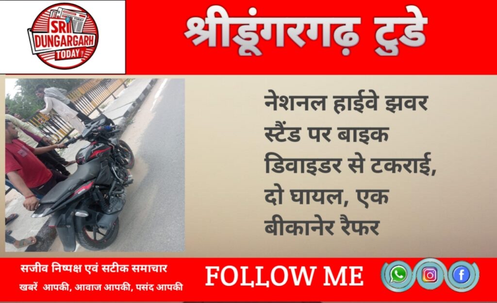 अभी कुछ देर पहले नेशनल हाईवे पर झंवर बस स्टैंड पर एक बाइक अनियंत्रित होकर डिवाइडर से टकरा गई जिसमें बाइक सवार दो जने घायल हो गए। सूचना मिलते ही डॉ एपीजे अब्दुल कलाम की टीम एंबुलेंस से घायलों को उपजिला अस्पताल लेकर पहुंची प्राथमिक उपचार के बाद जहां से एक घायल को बीकानेर रैफर कर दिया।घायल