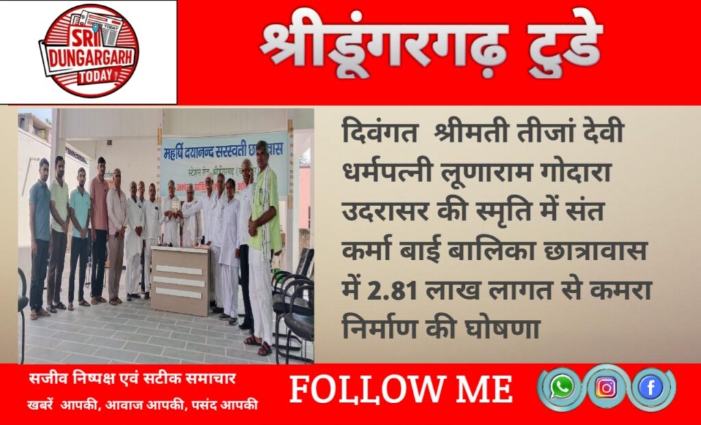 1. कमरा निर्माण– दिवंगत श्रीमती तीजां देवी धर्मपत्नी लूणाराम पुत्र तारुराम गोदारा उदरासर की स्मृति में सुपुत्र भंवरलाल, सन्तोष कुमार, ओमप्रकाश, बजरंगलाल गोदारा द्वारा 2.81 लाख की लागत से बालिका छात्रावास में कमरा निर्माण की घोषणा की एवं सौजन्यकर्ता सन्तोष कुमार गोदारा ने एक लाख रुपये की राशि मैनेजमेंट को सौंपी ।