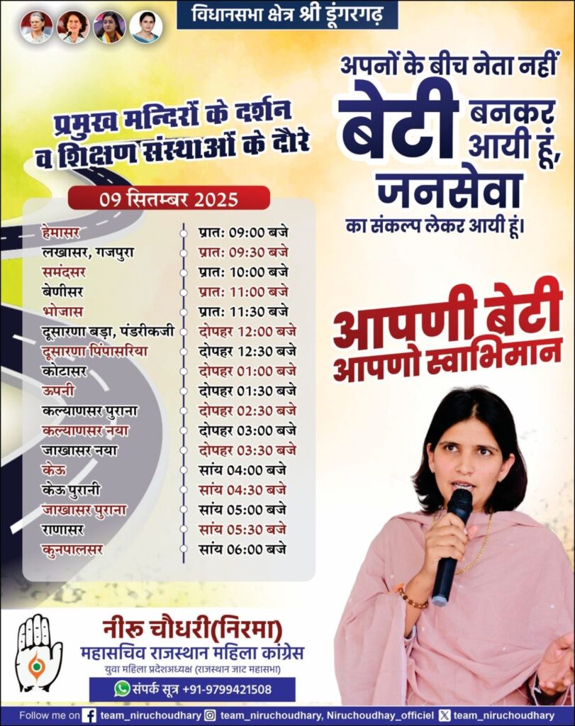 कांग्रेस नेत्री  ने बताया कि उन्होंने 28 अगस्त से 7 सितंबर तक क्षेत्र में देव दर्शन यात्रा की थी। अब आगामी दिनों में वे श्रीडूंगरगढ़ में जनसेवा केंद्र का शुभारंभ किया जाएगा। जिससे क्षेत्र की जनता से सीधा जुड़ाव होगा और जनहित के कार्यो को प्राथमिकता से किया जाएगा। उन्होंने बताया कि वे इस समय क्षेत्र के हर गांव गांव ढाणी ढाणी जाकर जनता से रूबरू होकर उनकी जनसमस्याओं को प्रशासनिक स्तर समाधान की कोशिश करना है। वे क्षेत्र के बीच एक नेता के रूप में ना जाकर एक बेटी के रूप में जा रही हैं।