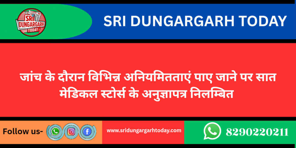 अनुज्ञापन प्राधिकारी एवं सहायक औषधि नियंत्रक देवेंद्र कुमार केदावत ने बताया कि खारवाली स्थित बाबा रामदेव मेडिकल एंड जनरल स्टोर का अनुज्ञापत्र 8 से 12 सितम्बर तक पांच दिनों के लिए, तिलक नगर स्थित अविनाश मेडिकल्स का अनुज्ञापत्र 8 से 15 सितम्बर तक 8 दिनों के लिए, भगत सिंह चौक खाजूवाला स्थित गोविंद मेडिकल स्टोर, सांखला फांटा श्री कोलायत स्थित आयुष मेडिकल एंड जनरल स्टोर के अनुज्ञापत्र 8 से 17 सितम्बर तक 10 दिनों के लिए, जयमलसर स्थित महादेव मेडिकल स्टोर, मैन चौराहा दंतोर स्थित श्री पिलानिया मेडिकल एंड जनरल स्टोर के अनुज्ञापत्र 10 से 19 सितम्बर तक 10 दिनों के लिए तथा मोमासर स्थित श्री लक्ष्मी मेडिकल एंड जनरल स्टोर का अनुज्ञापत्र 10 से 21 सितंबर तक 12 दिनों के लिए निलंबित कर दिया गया है।