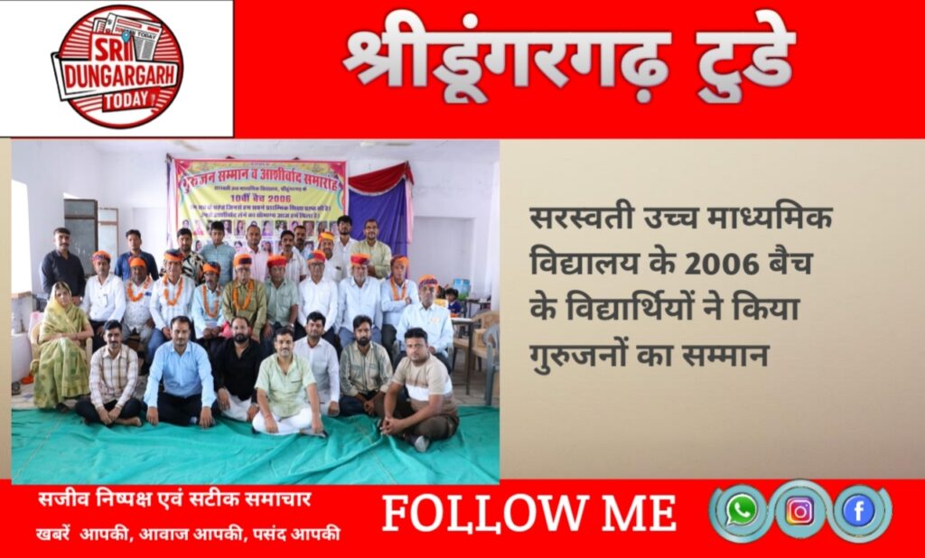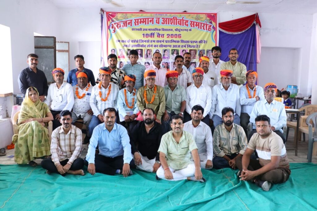 कस्बें के  नेहरू पार्क कालुबास  के पास स्तिथ सरस्वती उच्च माध्यमिक विद्यालय के 2006 में कक्षा 10 बैच के विधार्थियों ने बुधवार को  अपने गुरुजनों का सम्मान किया और उनसे आशीर्वाद लिया। विद्यार्थीयो ने बैंड बाजे के साथ अपने गुरुजनों का स्वागत किया कार्यक्रम की शुरुआत  विद्यालय की नींव रखने वाले  दिवंगत मदनलाल चूरा एंव  धनपतराय  चूरा  की तस्वीर पर पुष्प अर्पित करके और  गुरु वंदना से हुई  गुरुजन इस मान सम्मान से गदगद हो गए और गुरु और शिष्य के रिश्ते की गहराई को समझाया और अपने पुराने शिष्यों को देख कर भाव विभोर हो गए। इस मिलन समारोह  में 2006 के छात्र-छात्राएं शामिल हुए जिनमे कोई  आज फौजी देश मे सेवा कर रहा हैओ।  कोई बैंक मैनेजर, कोई, सीए, कोई इंजीनियर कोई प्रधानाचार्य, तो कोई  सुप्रसिद्ध गायक कलाकार बन चुका है। सभी शिष्यों ने  शाला में आज अपने गुरुजनों के सामने एक साधारण  दरी पर बैठकर अपने पुराने दिनों की याद ताजा की। कार्यक्रम में  विद्यालय की पूर्व छात्राए लाइव जुड़ी जो इस  कार्यक्रम में शामिल नही हो  पाई  उन्होंने अपनी भावनाएं सांझा की।  गुरुजनों ने इस कार्यक्रम की खूब  प्रशंसा की और सभी शिष्यों को आगे बढ़ने की और सही रास्ते पर चलने के लिए प्रेरित करते हुए आर्शीवाद दिया।