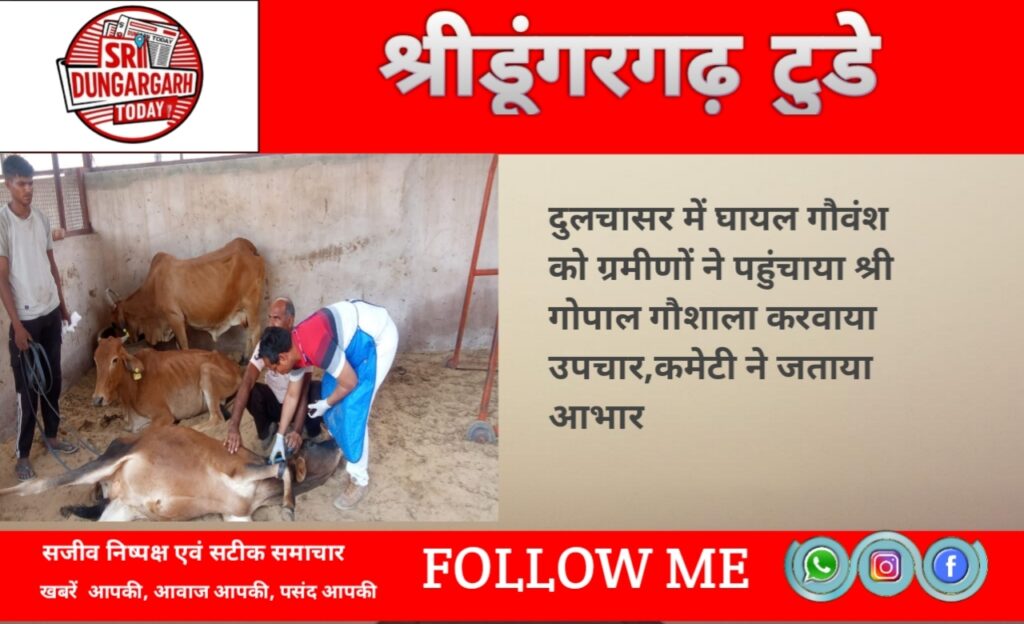 दुलचासर में घायल गौवंश को ग्रमीणों ने पहुंचाया श्री गोपाल गौशाला करवाया उपचार,कमेटी ने जताया आभार