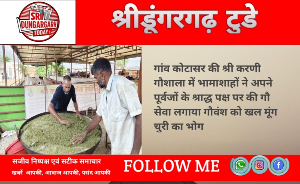 गांव कोटासर की श्री करणी गौशाला में आज बेंगलुरु प्रवासी श्याम सुंदर सुपुत्र उदाराम मोटियार पालना निवासी ने अपने दिवंगत दादा मंगलाराम एवं दिवंगत दादी सुगनी देवी मोटियार के श्राद्ध पर गो ग्रास के रूप में गौ वंश को मूंग चूरी का भंडारा समर्पित कर उनकी आत्मा शांति की कामना की गौशाला कमेटी आपके स्वर्गीय दादाजी एवं दादीजी को सादर श्रद्धांजलि अर्पित करते हुए उनकी आत्मा शांति हेतु कामना की । वहीं बीकानेर निवासी भामाशाह सुनील कुमार माथुर ने आज श्राद्ध पक्ष पर गौ वंश को मुंगचुरी का भंडारा समर्पित कर गौ सेवा का सौभाग्य प्राप्त किया गौशाला कमेटी ने दोनों ही भामाशाहों का आभार जताया।