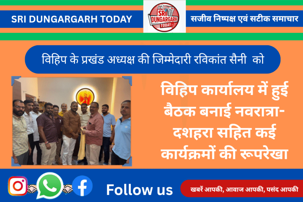 विश्व हिन्दू परिषद कार्यालय में गुरुवार रात 8 बजे हुई बैठक में संगठनात्मक बदलाव किए गए। बैठक में रविकांत सैनी को प्रखंड अध्यक्ष का दायित्व सौंपा गया। ज़िला अध्यक्ष जगदीश स्वामी ने दुपट्टा पहनाकर पदभार ग्रहण करवाया।पूर्व प्रखंड अध्यक्ष श्यामसुन्दर जोशी ने तीन साल के कार्यकाल का ब्योरा देते हुए दर्जनों कार्यक्रमों की जानकारी साझा की।जिला अध्यक्ष स्वामी ने बताया कि संघ के शताब्दी समारोह की तैयारियों को लेकर कार्यकर्ताओं को जिम्मेदारी सौंपी गई है।नवनियुक्त अध्यक्ष रविकांत सैनी ने संगठन व समाज सेवा के लिए हर समय तत्पर रहने का संकल्प लिया। उन्होंने कार्यकर्ताओं से ज्यादा से ज्यादा युवाओं को जोड़ने का आह्वान किया और नवरात्रा व दशहरा कार्यक्रमों की रूपरेखा पर चर्चा की। बैठक में जिला सहमंत्री वासुदेव सारस्वत, नगर अध्यक्ष लाल सिंह जोशी, मंत्री दीपक सेठिया, गौ रक्षा प्रमुख भीखाराम सुथार, उपाध्यक्ष अशोक नाई, धर्म जागरण प्रमुख अशोक बैद, प्रशासन प्रमुख फतेह सिंह जांगिड़, नगर प्रशासन प्रमुख भूषण करवा, बजरंग दल सह संयोजक पवन व्यास सहित अन्य कार्यकर्ता मौजूद रहे।