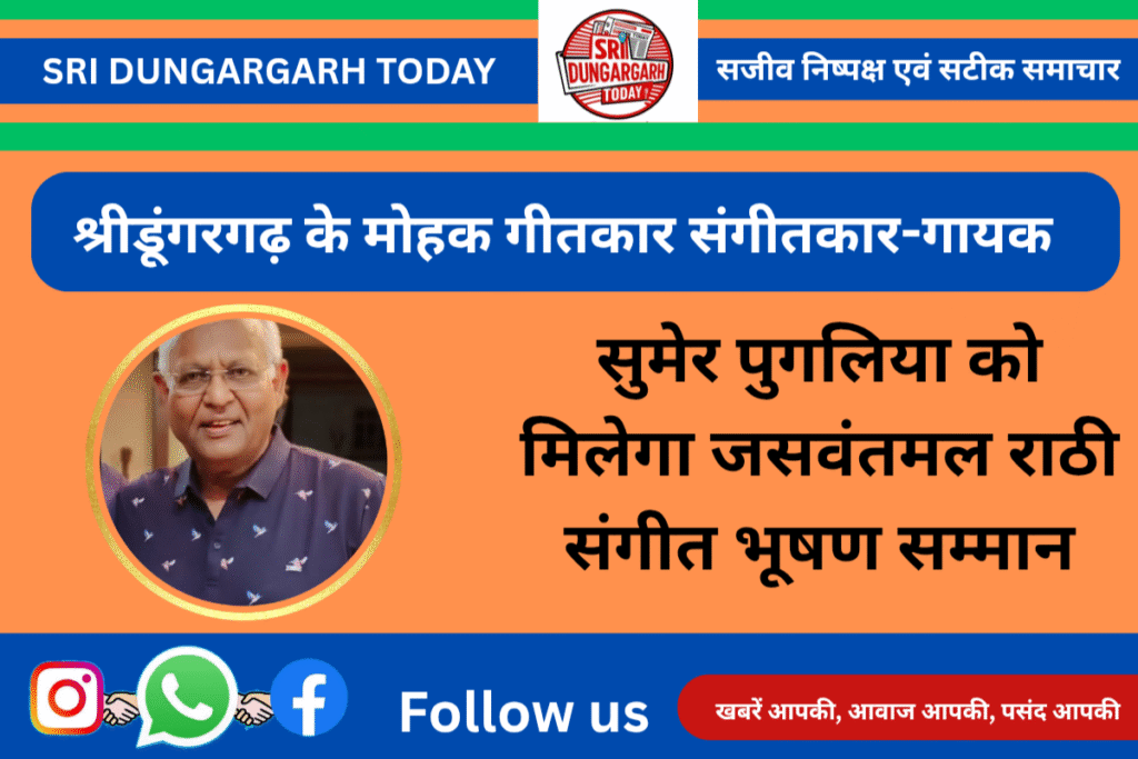 गुणीजन सम्मान समारोह समिति द्वारा इस बार जसवंतमल राठी स्मृति संगीत भूषण सम्मान वरिष्ठ गीतकार,संगीतकार गायक तथा राजस्थानी लोक रंग से ओतप्रोत सुमेरमल पुगलिया को प्रदान किया जाएगा।