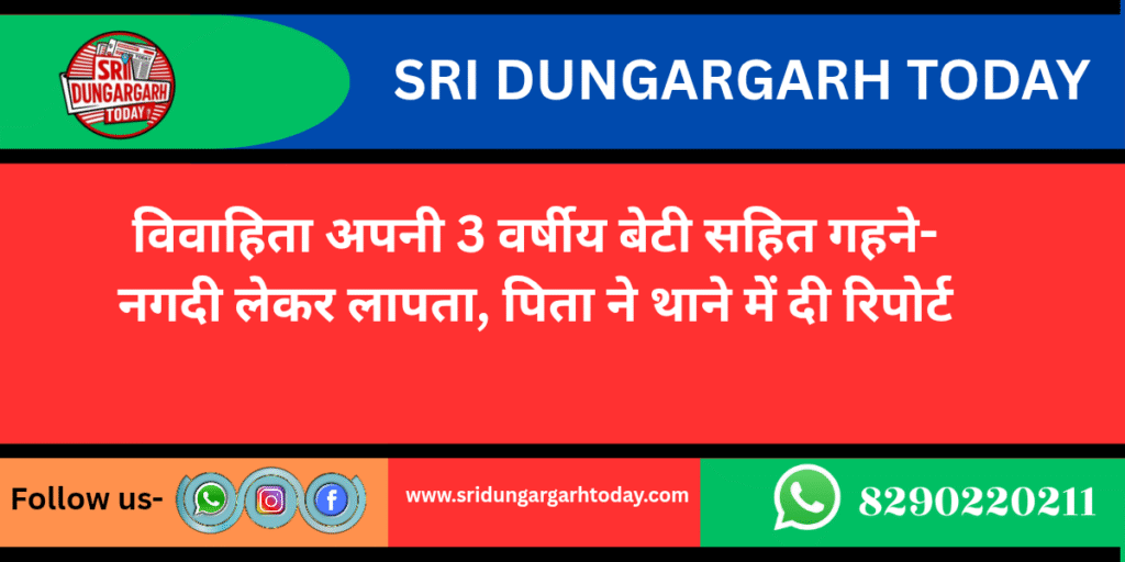 क्षेत्र के गांव अभयसिंहपुरा निवासी भागुराम की 22 वर्षीय विवाहिता बेटी अपने 3 वर्षीय पुत्री और गहने-नगदी लेकर लापता हो गई।परेशान पिता ने पुलिस थाने में गुमशुदगी दर्ज करवाते हुए ढूंढ लाने की गुहार लगाई पिता ने पुलिस को को बताया कि बेटी अपने दो बच्चों संग ससुराल से पीहर आई हुई थी और 9 सितंबर को सुबह करीब 9 बजे ढाणी अपने एक बेटे को छोड़कर गायब हो गई। और संदूक से 30 हजार रुपये नगद व सोने-चांदी के गहने (सोने की ठुस्सी, कानों के बाले, नाक की बाली, चांदी की पायल व कड़े) आदि समान भी गायब मिला। काफी तलाश के बाद भी पता नही चलने पर पिता ने थाने में रिपोर्ट दी। पुलिस ने गुमशुदगी दर्ज कर जांच हैड कांस्टेबल बलवीरसिंह को सौंपी है।