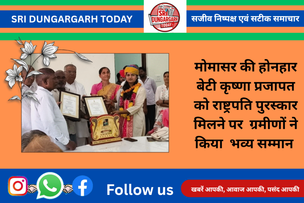 मोमासर की होनहार बेटी कृष्णा प्रजापत को राष्ट्रपति पुरस्कार मिलने पर ग्रमीणों ने किया भव्य सम्मान