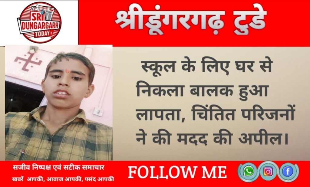 क्षेत्र के गांव दुलचासर से एक बालक  घर से स्कूल जाने के लिए निकला और  लापता हो गया है। मिली जानकारी के अनुसार दुलचासर गांव निवासी 15 वर्षीय बालक रमेश पुत्र ओमप्रकाश कस्वां  आज शुक्रवार सुबह छह बजे स्कूल जाने के लिए घर से निकला था। लेकिन बीच रास्ते में कहीं गुम हो गया है। बालक 10वीं कक्षा का छात्र है। दिनभर परिजनों ने बालक की तलाश के कई प्रयास किए है। उसे गांव में दोस्तों के यहां, रिश्तेदारों से पूछताछ के बाद कोई सुराग नही मिलने पर चिंतित पिता ने आमजन से अपील की है कि यह बच्चा जहां कभी भी दिखें। तुरन्त  9588918190 इस नम्बर पर सूचित करें।