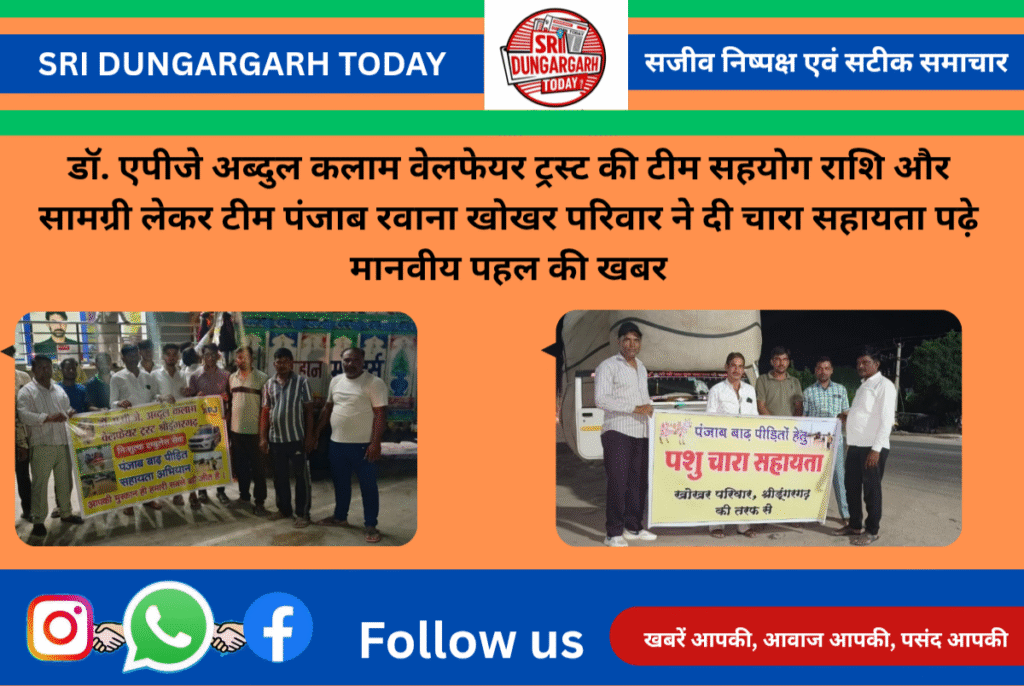 डॉ. एपीजे अब्दुल कलाम ट्रस्ट की टीम श्रीडूंगरगढ़ से पंजाब रवाना हुई, जहां यह सहयोग राशि पीड़ित परिवारों तक पहुंचाई जाएगी। इस दौरान मौलाना फजले हक ट्रस्ट टीम के सेवादार अमीर खान क्यामखानी, खाजू खान क्यामखानी, रोशन अली, मुख्तयार कोहरी, प्रेम सारस्वत, साबूदीन मुवाल, आजम बेहलीम,हारून ठेकदार, महबूब छींपा, नाजिम खान, महबूब सोलंकी बाबू काजी, सकील पिंजरा, सोहेल, शाहिद, इमरान छींपा, अहमद, छोटू राणा, नवाब, कालूराम जाट धीरज स्वामी, अकबर सहित अनेक सदस्य मौजूद रहे। वही टीम में अमीर खान क्यामखानी खाजू खान क्यामखानी रोशन अली मुख्तयार कोहरी रिकु भाई इमरान छींपा सोहिल आदिल नवाब अहमद महबूब छींपा मुकेश कुमार धोनी काजी शहीद कमल किशोर पंजाब रवाना हुए।