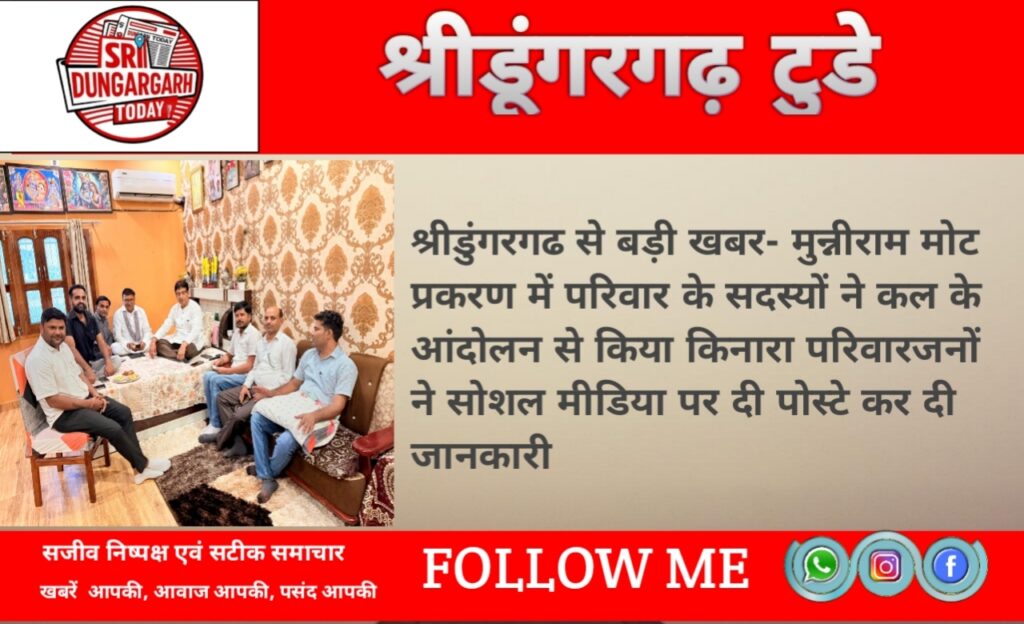 मुन्नीराम मोट प्रकरण में परिवार के सदस्यों ने कल के आंदोलन से किया किनारा परिवारजनों ने सोशल मीडिया पर दी पोस्टे कर दी जानकारी परिवार की सारस्वत स्वयंसेवक संघ के साथ विस्तृत चर्चा हुई। जिसके सकारात्मक परिणाम मिले है। परिवार जनों सर्व समाज का आभार जताते हुए धन्यवाद दिया।ओर अपील कि इस प्रकरण को लेकर कोई भी आंदोलन करने वालों को हमारे परिवार का कोई समर्थन नहीं है । अत: इस विषय पर किसी भी प्रकार की राजनीति व अनर्गल टिप्पणीयों से बचें