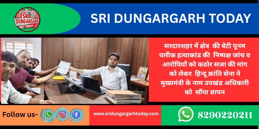 श्रीडूंगरगढ़ क्षेत्र के गांव डेलवां की बेटी पूनम पारीक के निर्मम हत्याकांड को लेकर आज हिन्दू क्रांति सेना राजस्थान इकाई ने आरोपियों के खिलाफ सख्त कार्यवाही की मांग को लेकर मुख्यमंत्री के नाम उपखंड अधिकारी को ज्ञापन सौंपा हिन्दू क्रान्ति सेना के अध्यक्ष श्याम गिरी गुसाई ने बताया कि क्षेत्र के नजदीकी शहर सरदारशहर में श्रीडूंगरगढ़ क्षेत्र के गांव डेलवां गांव की बेटी पूनम पारीक के निर्मम हत्या कर दी गई। हत्या के बाद पुलिस ने देवर को गिरफ्तार कर लिया व हत्याकांड का खुलासा भी कर दिया गया। लेकिन परिवार व सर्वसमाज पुलिस जांच से असंतुष्ट हैं। हिन्दू क्रांति सेना ने ज्ञापन के माध्यम से मुख्यमंत्री से निवेदन किया कि इस निर्मम जघन्य हत्याकांड की त्वरित निष्पक्ष जांच करवाई जाए तथा फास्ट ट्रैक कोर्ट में मुकदमा चलाकर दोषियों को जल्द से जल्द फांसी की सजा दिलाई जाए। संगठन ने कहा कि ऐसी घटनाओं से समाज में भय और आक्रोश व्याप्त है, इसलिए पीड़ित को न्याय दिलाना आवश्यक है। ज्ञापन सौंपने के दौरान हिंदू क्रान्ति सेना अध्यक्ष श्याम गिरी, टेक्सी यूनियन अध्यक्ष गौरीशंकर स्वामी, भवानी पारीक, आनंद जोशी, ओमप्रकाश नाई, तार सिंह ओड, दयाल बाना, सोनू सिंह और लेखराम नाई सहित अनेक कार्यकर्ता मौके पर मौजूद रहे।