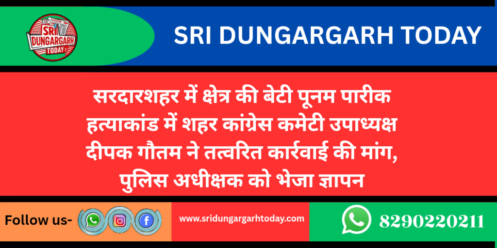 क्षेत्र के गांव डेलवां की बेटी पूनम पारीक की सरदारशहर में ससुराल के घर में हुई निर्मम हत्या के बाद पूरे क्षेत्र में आरोपियों के खिलाफ रोष व्याप्त है। बुधवार को कस्बें के पूर्व पार्षद व शहर कांग्रेस कमेटी के उपाध्यक्ष दीपक गौतम ने पुनम पारीक हत्याकांड की तत्वरित कार्यवाही को लेकर जिला पुलिस अधीक्षक (चुरू) को ज्ञापन भेजा ज्ञापन में बताया कि सरदारशहर में घटित पूनम पारीक हत्याकांड एक अत्यंत गंभीर व जघन्य अपराध है इस घटना से समूचे क्षेत्र में भय व आक्रोश व्याप्त है। इस प्रकार की घटना न केवल कानून व्यवस्था के लिए चुनौती है, बल्कि प्रदेश की शांति सुरक्षा व्यवस्था पर भी गंभीर सवाल खड़े करती है। दीपक ने ज्ञापन के माध्यम से एसपी से निवेदन किया कि निर्मम जघन्य हत्याकांड की त्वरित गहन व निष्पक्ष जांच करवाई जाए। अपराधियों को तुरंत गिरफ्तार कर कठोर दंडात्मक कार्यवाही की जाए,पीड़ित परिवार को जल्द न्याय दिलाने के लिए हर संभव मदद की जाए। साथ ही भविष्य में ऐसी घटनाओं की पुनरावृति रोकने के लिए कड़े कदम उठाने की मांग की। दीपक गौतम ने कहा कि यदि शीघ्र कार्रवाई की गई तो आमजन का पुलिस प्रशासन के प्रति विश्वास व सुरक्षा की भावना और मजबूत होगी।
