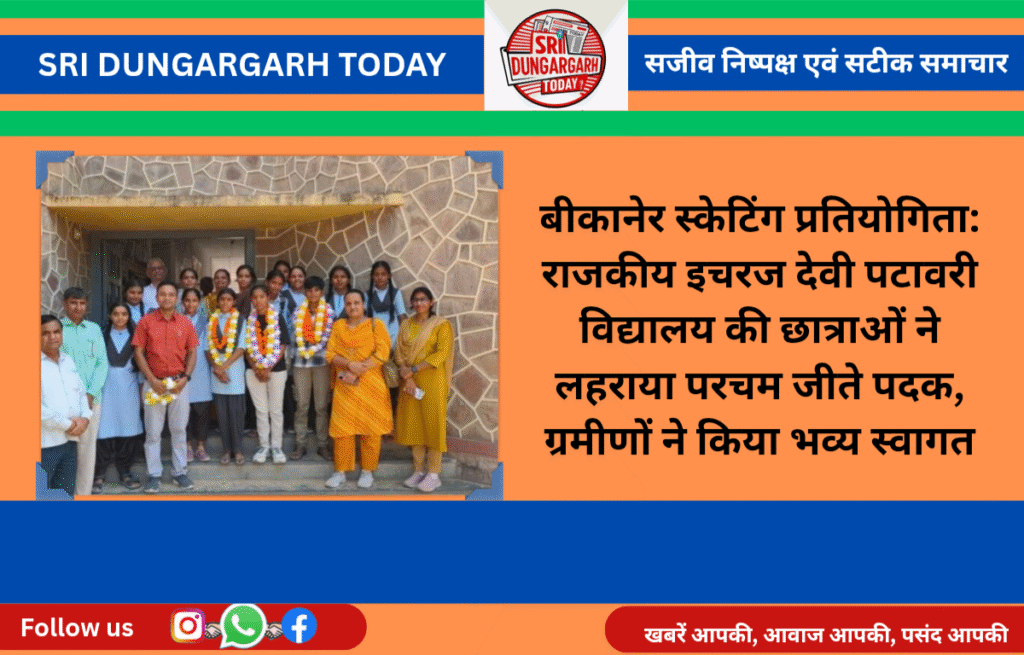 राजकीय इचरज देवी पटावरी विद्यालय की प्रतिभाशाली छात्राओं ने बीकानेर में आयोजित 14 वर्षीय स्केटिंग प्रतियोगिता में शानदार प्रदर्शन करते तीन पदक हासिल किए आइना पुत्री श्री ओमप्रकाश- स्वर्ण पदक, संगीता पुत्री श्री ताराचंद- रजत पदक विक्कीसा पुत्री श्री सांवरमल कांस्य पदक हासिल कर क्षेत्र व गांव का नाम रोशन किया आइना और संगीता का राज्य स्तर पर चयन होने से पूरे क्षेत्र में हर्ष का माहौल है।