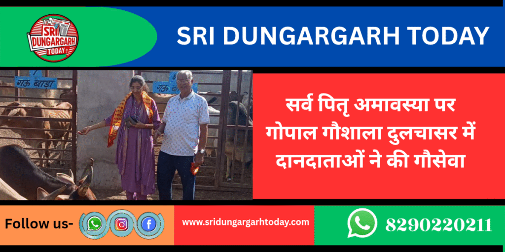 आज सर्व पितृ अमावस्या श्राद्ध पक्ष के दौरान अपने पूर्वजों व पितरों को सादर श्रद्धांजलि अर्पित कर सुनिता देवी संजय कुमार लोहिया निवासी श्री डूंगरगढ़ प्रवासी जयगांव (बंगाल) के द्वारा श्री गोपाल गौशाला दुलचासर की गोमताओं को खल मुंग चूरी तथा गुड़ का पावन भंडारा का अपने हाथों से भोग लगाया।और रु4100/-की पावन राशि भी समर्पित की इस दौरान भंडारा वितरण में श्याम सुन्दर सुपुत्र रामचंद जी मुंधड़ा निवासी दुलचासर ने सहयोग किया। सचिव रेवन्त सिंह पड़िहार ने बताया कि वहीं गौशाला की गौ माताओं के लिए रणजीत सिंह पड़िहार ने रू500/-की पावन राशि समर्पित कि और नथुराम सुपुत्र दिवंगत मोडाराम सुथार निवासी दुलचासर ने एक बोरी मूंग चूरी समर्पित कि और अनिल कुमार सुपुत्र अशोक कुमार महिया निवासी दुलचासर ने दो बोरी मूंग चूरी समर्पित कि वहीं बंजरग लाल सुपुत्र मोहन लाल सुथार निवासी दुलचासर ने रू1000/-की पावन राशि समर्पित कि और कुशाल चन्द मुंधड़ा निवासी दुलचासर ने रू2100/-की पावन राशि समर्पित कि वहीं मूलचंद रेवन्त मल मुंधड़ा निवासी दुलचासर ने रू2100/-की पावन राशि समर्पित कि। समस्त गौ भक्तों का गौशाला कमेटी ने दानदाताओं का आभार जताया।