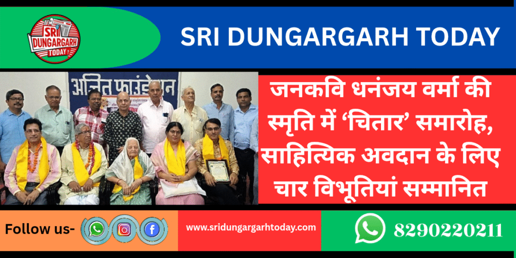 बीकानेर। सुरभि, अजित फाउंडेशन और शाद्वल के संयुक्त तत्वावधान में 20 सितंबर को प्रबुद्ध मनीषियों के साथ अजित फाउंडेशन सभागार में कीर्तिशेष लोकप्रिय राजस्थानी कवि गीतकार धनंजय वर्मा की स्मृति में ‘चितार’ समारोह आयोजित किया गया। सुरभि के गोविन्द जोशी ने बताया कि बताया कि इस अवसर पर इतिहास और संस्कृति वेत्ता जानकी नारायण श्रीमाली सहित राजस्थानी साहित्य में विशिष्ट अवदान देने वाली विभूतियों रवि पुरोहित, राजेन्द्र स्वर्णकार एवं मनीषा आर्य सोनी को सम्मानित किया गया।