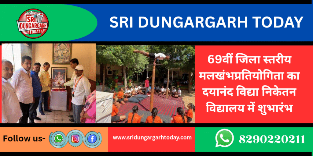 69 वी जिला स्तरीय मलखंभ प्रतियोगिता का आगाज आज दयानंद विद्या निकेतन विद्यालय में शुरु हुआ उद्घाटन समारोह के मुख्य अतिथि जयपुर पब्लिक स्कूल व रमन आईटीआई के निदेशक कुम्भाराम तथा विशिष्ट अतिथि आर्यस्थली गुरुकुल के निदेशक अमित स्वामी रहे। कार्यक्रम की शुरुआत दीप प्रज्वलन से हुई।