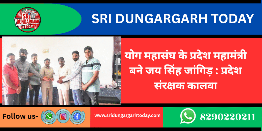 श्रीडूंगरगढ़ कस्बे के राजस्थान योग प्रशिक्षक महासंघ के प्रदेश संरक्षक ख्याति प्राप्त योगाचार्य ओम प्रकाश कालवा ने जानकारी देते हुए बताया रविवार दोपहर सीकर प्रवास पर आयुष सेवा संस्थान पर राजस्थान योग प्रशिक्षक महासंघ के प्रदेश कार्यकारी अध्यक्ष योगाचार्य राकेश कुमार तुनवाल की विशेष अनुसंशा पर लंबे समय से सेवा दे रहे कर्मठ कार्यकर्ता योगाचार्य जय सिंह जांगिड़ सीकर को योग महासंघ का प्रदेश महामंत्री पद पर नियुक्त किया इस दौरान आयुष सेवा संस्थान के निदेशक व योग महासंघ के प्रदेश अध्यक्ष क्रांतिकारी योगाचार्य रामावतार यादव, योग महासंघ के प्रदेश महासचिव मनोज सैनी ने पतंजली योग पीठ हरिद्वार में बैठे ऑन लाइन विडियो कॉल कर बधाई दी, लाला राजस्थानी श्री डूंगरगढ़ व बालिका स्वाध्याय निशुल्क लाइब्रेरी के व्यवस्थापक हरीश कुमार शर्मा फतेहपुर, विकाश कुमार शर्मा सभी ने जांगिड़ को प्रदेश महामंत्री की नियुक्ती पर हार्दिक बधाई एवं शुभकामनाएं दी