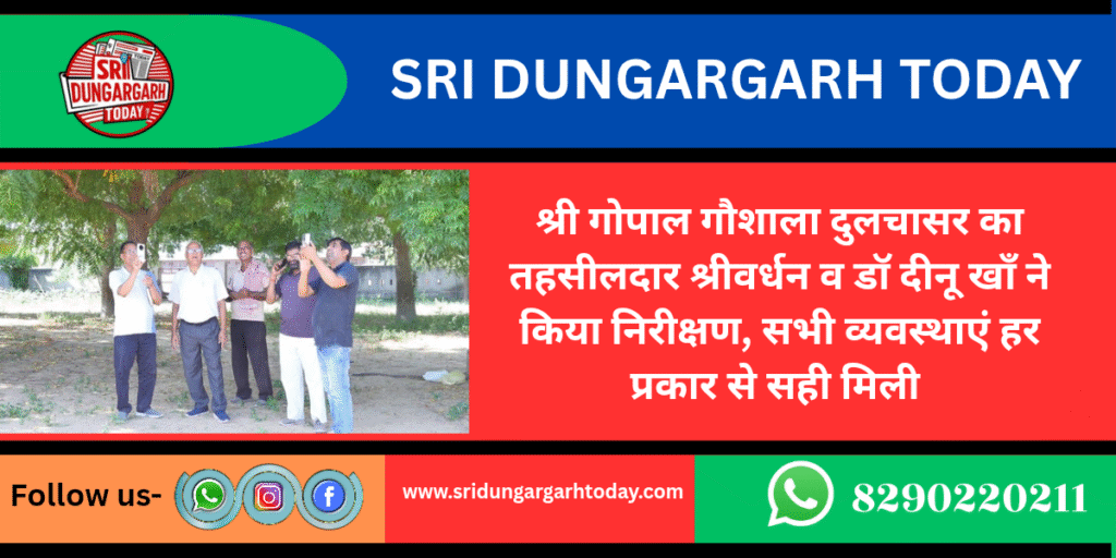 21 सितबंर 2025, रविवार को श्री गोपाल गौशाला प्रबंध विकास समिति दुलचासर में भौतिक सत्यापन निरीक्षण हेतु तहसीलदार श्रीवर्धन एवं डॉ दिनूं खां पहुंचे इस दौरान गौशाला का भ्रमण कर अवलोकन किया। गौशाला के सम्पूर्ण दस्तावेजों की जांच पड़ताल की और गौवंश की गणना कर चारा, पानी, पशु आहार, छायां, चारा भंडारगृह, साफ सफाई व्यवस्था सहित गोवंश स्वास्थ्य संबंधी सभी प्रकार की जांच की। जो पुर्णतया हर प्रकार से सही पाई गई। इस पर तहसीलदार श्री वर्धन ने गोशाला संचालक रेवन्त सिंह पड़िहार की प्रशंसा सचिव रेवन्त सिंह पडिहार ने सभी का आभार जताया इस दौरान बड़ी सख्या में ग्रामीण भी उपस्थित रहे।