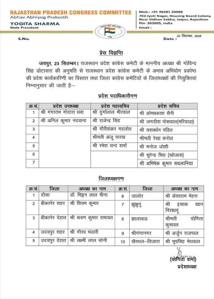 राजस्थान प्रदेश कांग्रेस कमेटी ने मंगलवार को संगठन के अभाव अभियोग प्रकोष्ठ में पदाधिकारियों की नियुक्ति सूची जारी की गई है। सूची में श्रीडूंगरगढ़ कांग्रेस की महिला नेत्री अंजू पारख को प्रदेश महासचिव का दायित्व सौंपा   गया है। पारख ने निष्ठापूर्ण दायित्व निर्वहन की बात कहते हुए नई जिम्मेदारी मिलने पर पार्टी के प्रदेशाध्यक्ष गोविंद सिंह डोटासरा सहित पार्टी के शीर्ष नेताओं का आभार जताया है। पारख की नियुक्ति पर क्षेत्र के  कांग्रेसी कार्यकर्ताओं ने शुभकामनाएं दी