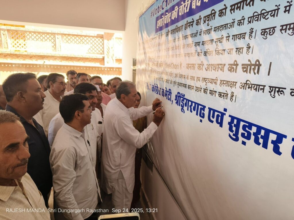 प्रदेश कांग्रेस अध्यक्ष गोविन्द सिंह डोटासरा के निर्देशानुसार मंगलवार को तेजा मंदिर में ‘वोट चोर गद्दी छोड़’ हस्ताक्षर अभियान की बैठक आयोजित हुई। बैठक की अध्यक्षता पूर्व विधायक व वरिष्ठ कांग्रेस नेता मंगलाराम गोदारा ने की, जबकि मुख्य अतिथि जिलाध्यक्ष बिशनाराम सियाग और विधानसभा प्रभारी रामदेव ढाका रहे।
